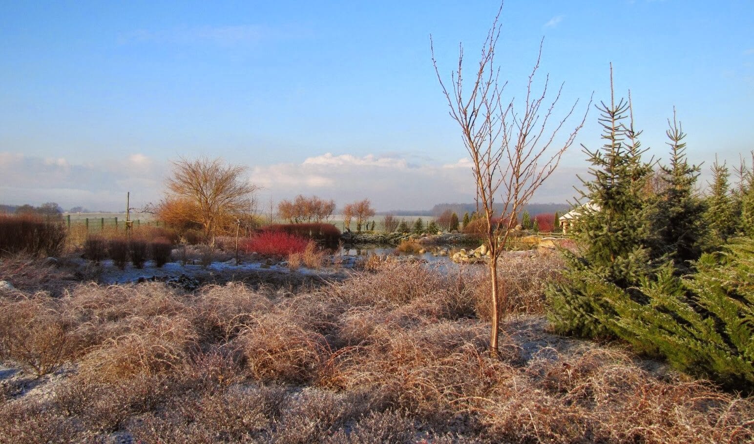 Późna jesień z mglistymi porankami, wśród których wyłaniają się mocniejsze barwy zimozielonych lub kolorowych krzewów, białe pnie brzóz, rude hortensje czy srebrzyste lub brązowe byliny na tle jasnych traw ozdobnych może być tajemnicza i urokliwa. Zima wzmocni kontrasty gdy doda białą szadź na ciemnych liściach ostrokrzewu, laurowiśni, ognika czy na wiotkich gałęziach drzew albo przyprószy śniegiem ozdabiając nasze ogrody.